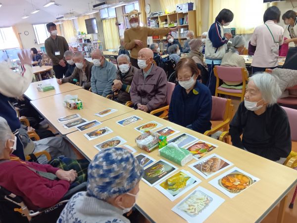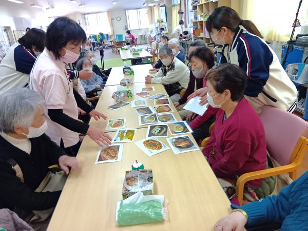 チョコ・抹茶・イチゴポッキーに見立てた職員手作りの棒を束の中から1本ずつ抜いていき、最終的に束が倒れた方が負けのゲームです。皆さんドキドキしながら、1本ずつ抜いています。見ている皆様も自分の事の様にハラハラドキドキ...とても刺激的なゲームで楽しく大盛り上がりでした。