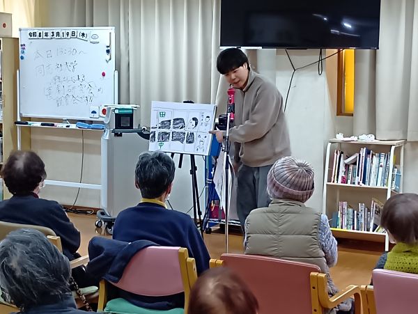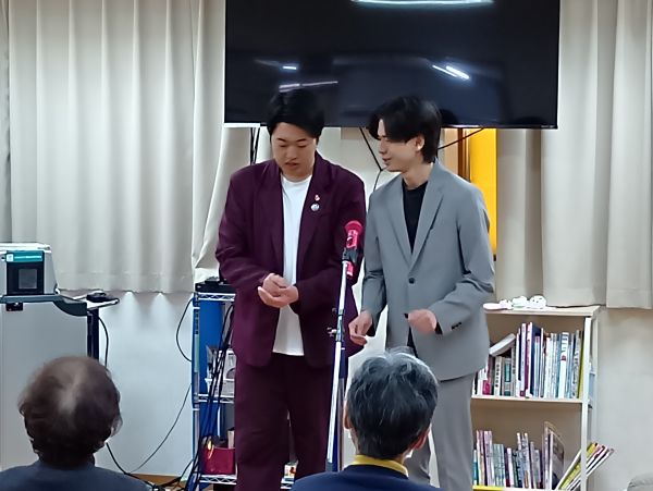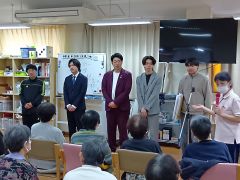本日、同志社大学喜劇研究会の皆様がお越しくださり、漫才(おかわりアイロニーさん)、コント(スプーンわんこ2頭)、フリップ芸(コンタクト屋さん)を其々披露して頂き、最後に利用者様、スタッフと共に美空ひばりさんの『川の流れのように』を熱唱して大盛況のうちに公演の幕を閉じました。大学生らしい活気と言葉を巧みに操って、笑いを生み出す話芸に利用者様のみならず、スタッフも大いに楽しませて頂きました。